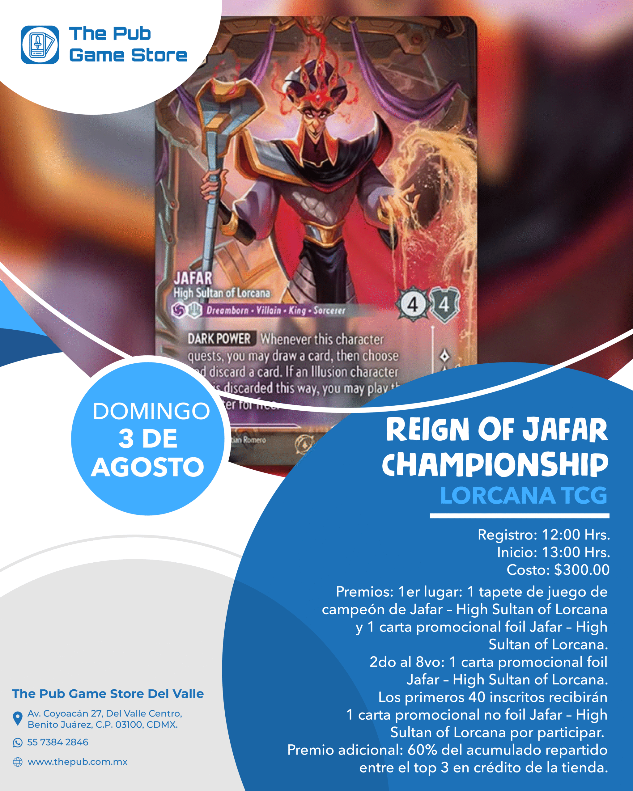 Premios: 1er lugar: 1 tapete de juego de campeón de Jafar – High Sultan of Lorcana y 1 carta promocional foil Jafar – High Sultan of Lorcana.